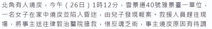 12月26日據港媒報道,盧惠光的前妻黎淑嫻于今日在北角家中燒炭自盡,兒子發現出事后將昏迷不醒的她送往醫院,可惜送醫院后仍然不治身亡,終年47歲。