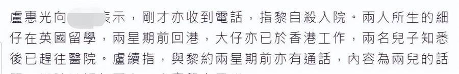 盧惠光還向港媒透露,是接到電話得知黎淑嫻自盡,兩人所生的小兒子在英國留學,兩個星期之前才回港,大兒子也在香港工作,兩名兒子得知噩耗后已經趕往醫院。
