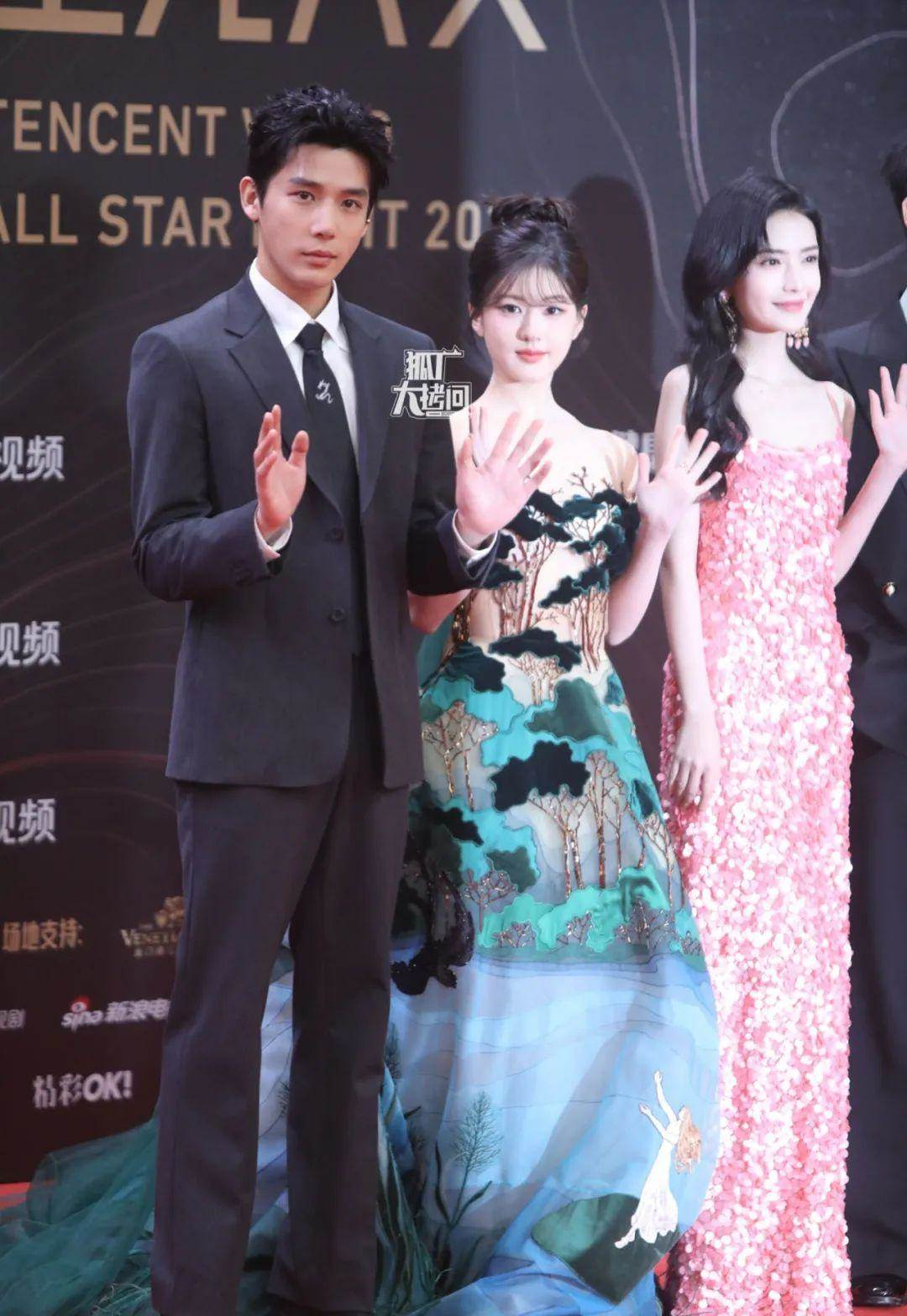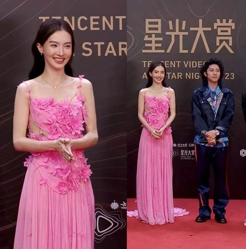 趙露思這條裙子名為「花海禮裙」,花紋很漂亮,露膚度也剛剛好,但長相偏可愛且身材嬌小的她不太能穿出裙子的美,有點像小孩子偷穿大人衣服的感覺。趙露思身旁的00后新疆演員加奈那穿的是粉色亮片吊帶裙,搭配長卷發很有女人味。