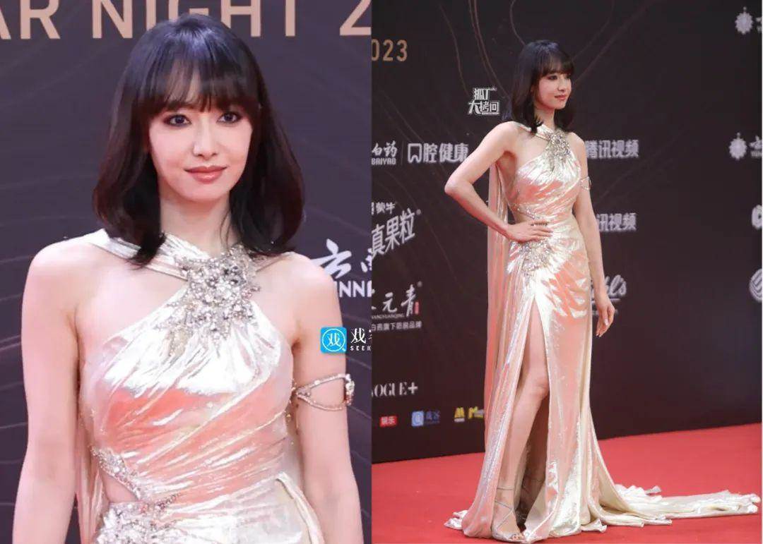 宋茜的禮裙也是金色的,是一條比較能凸顯腰身的高開叉長裙。不過這個煙熏妝讓她看起來有點老氣了,換個妝容會更好。