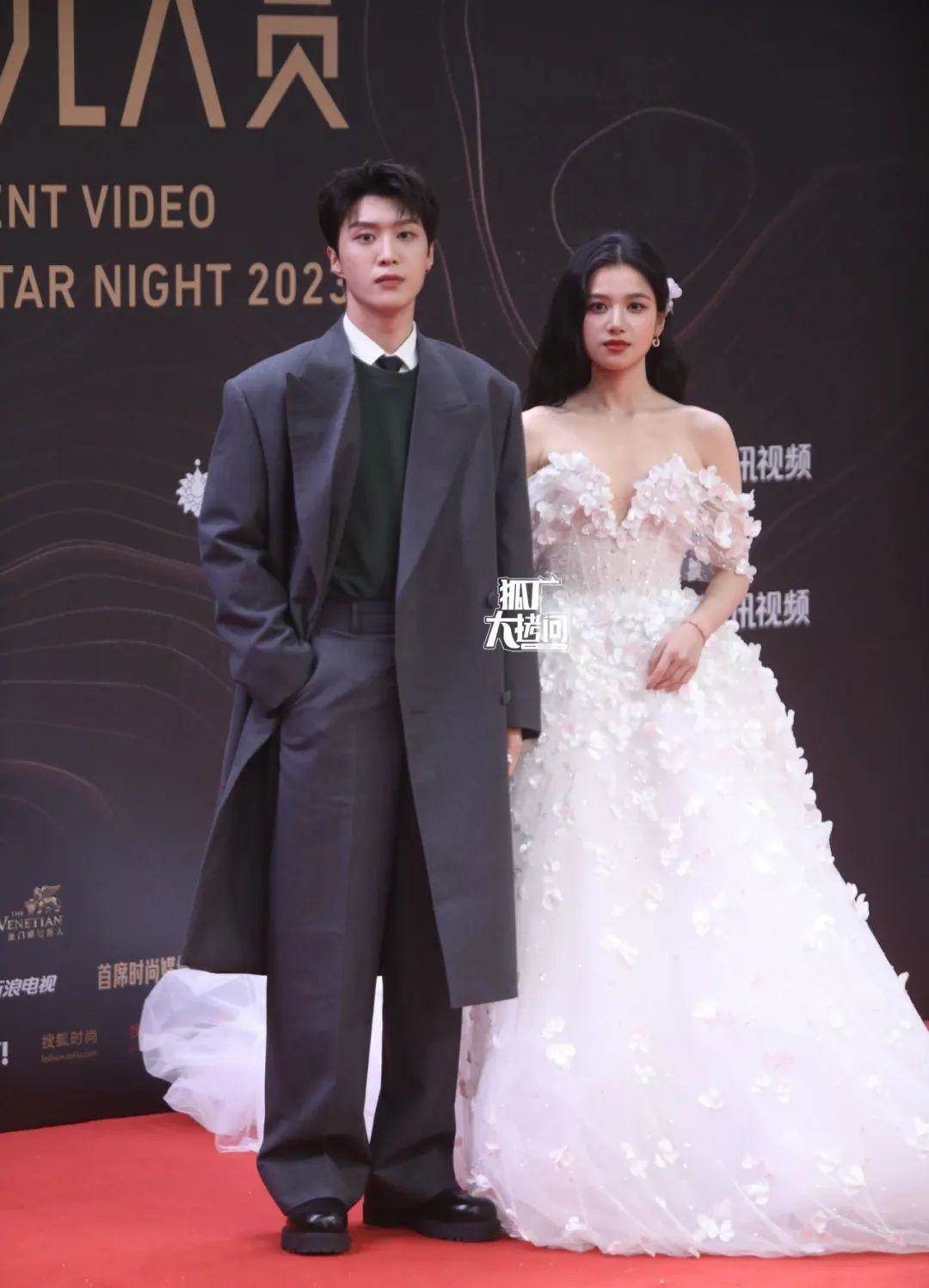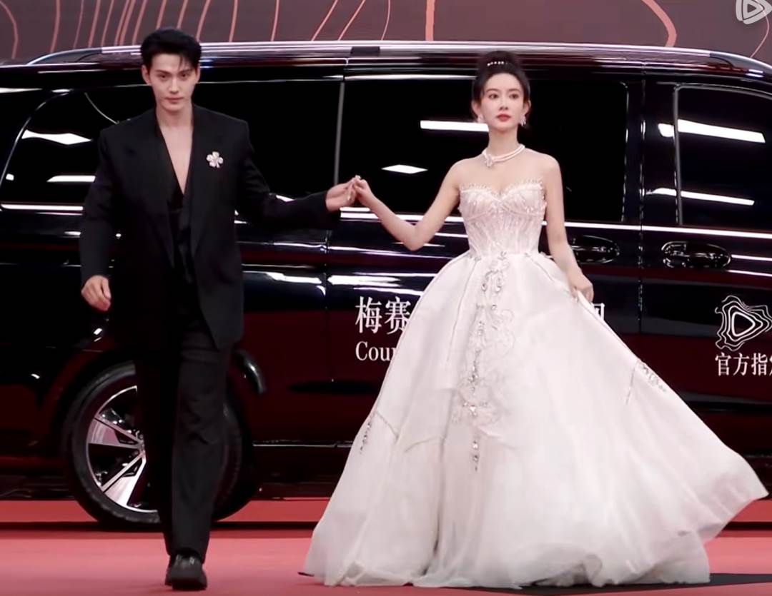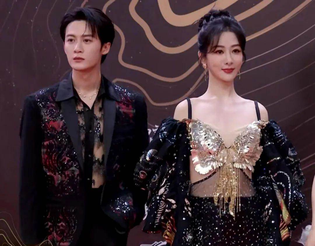 不過這條鎏金長裙也有一點不好,畢竟楊紫肩膀比較窄,所以會讓她顯得頭大身小。仔細看才發現檀健次的襯衫是透視設計的,兩人的禮服都很華麗,像在穿情侶裝。