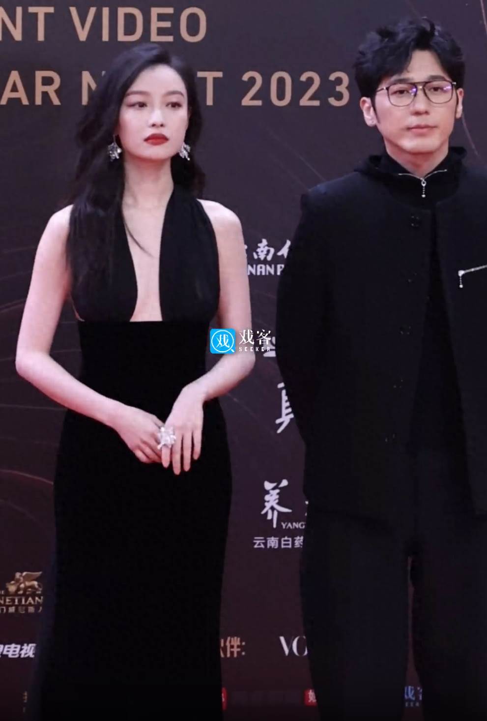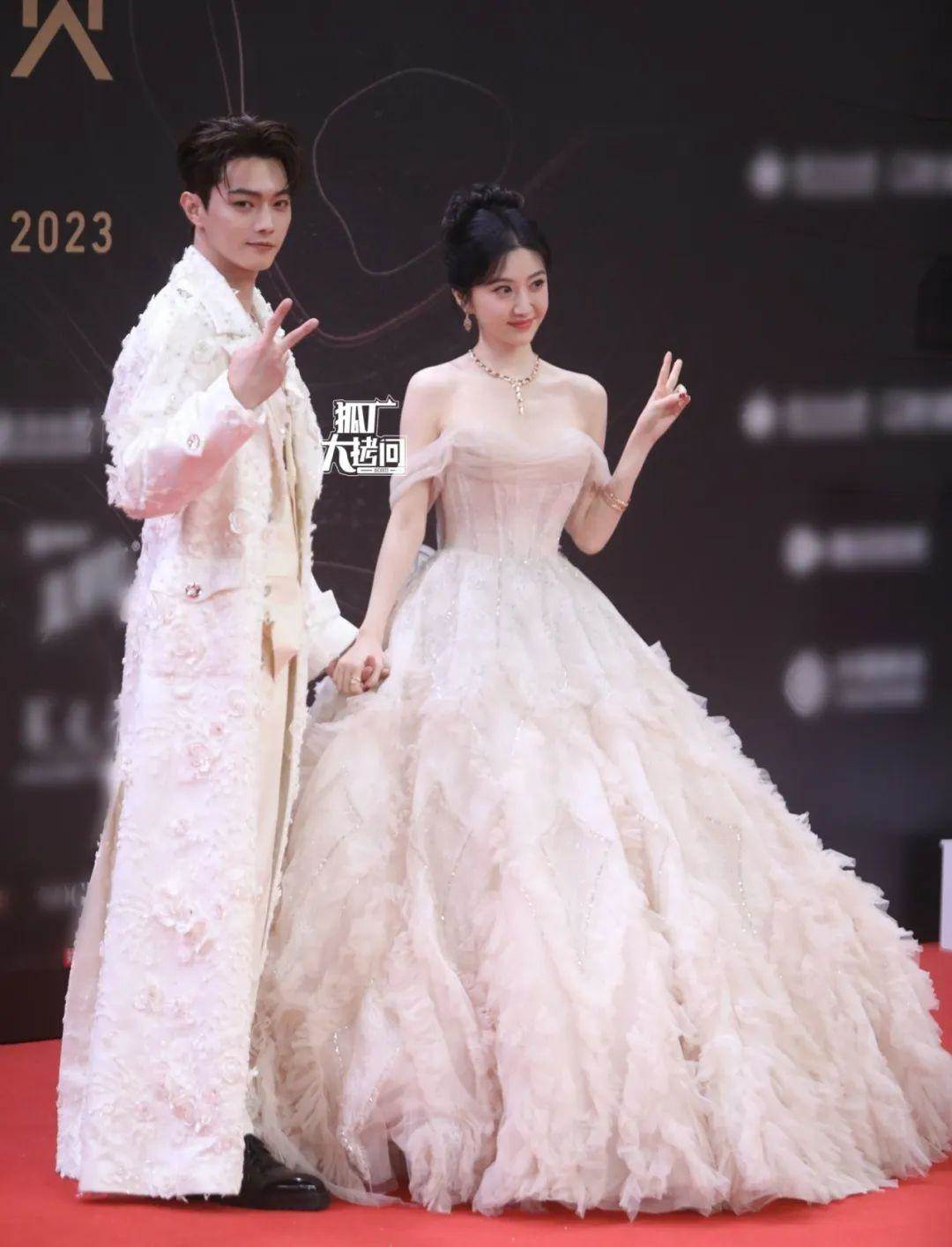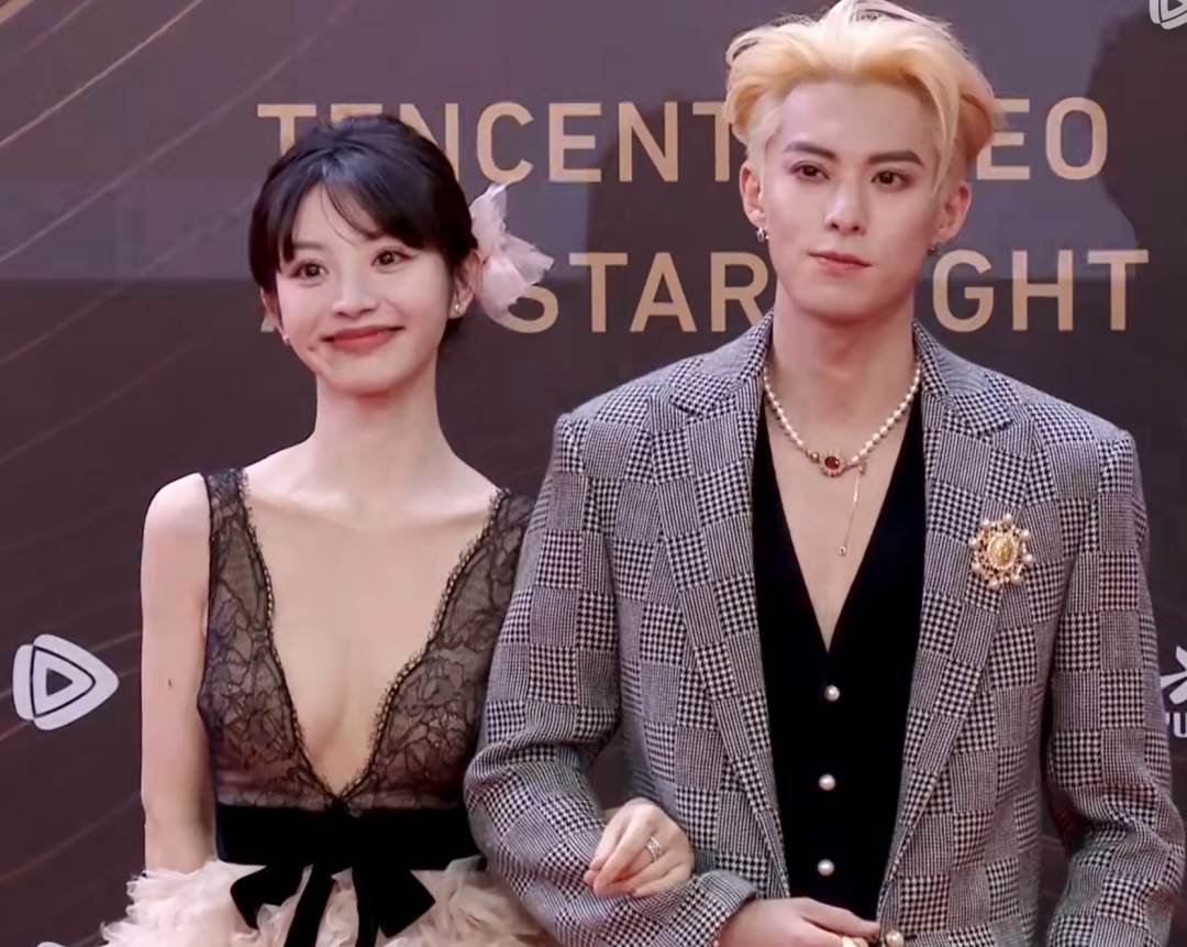 不過這條鎏金長裙也有一點不好,畢竟楊紫肩膀比較窄,所以會讓她顯得頭大身小。仔細看才發現檀健次的襯衫是透視設計的,兩人的禮服都很華麗,像在穿情侶裝。