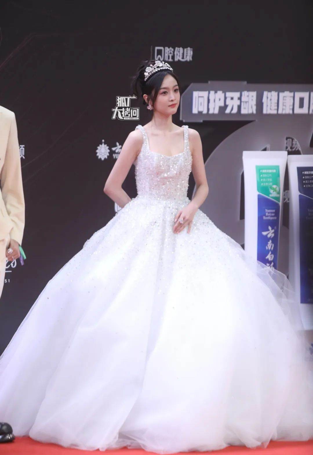 楊紫第二套紅毯禮服是白色蓬蓬裙,是不會出錯的款式,但跟第一套相比就比較普通了。