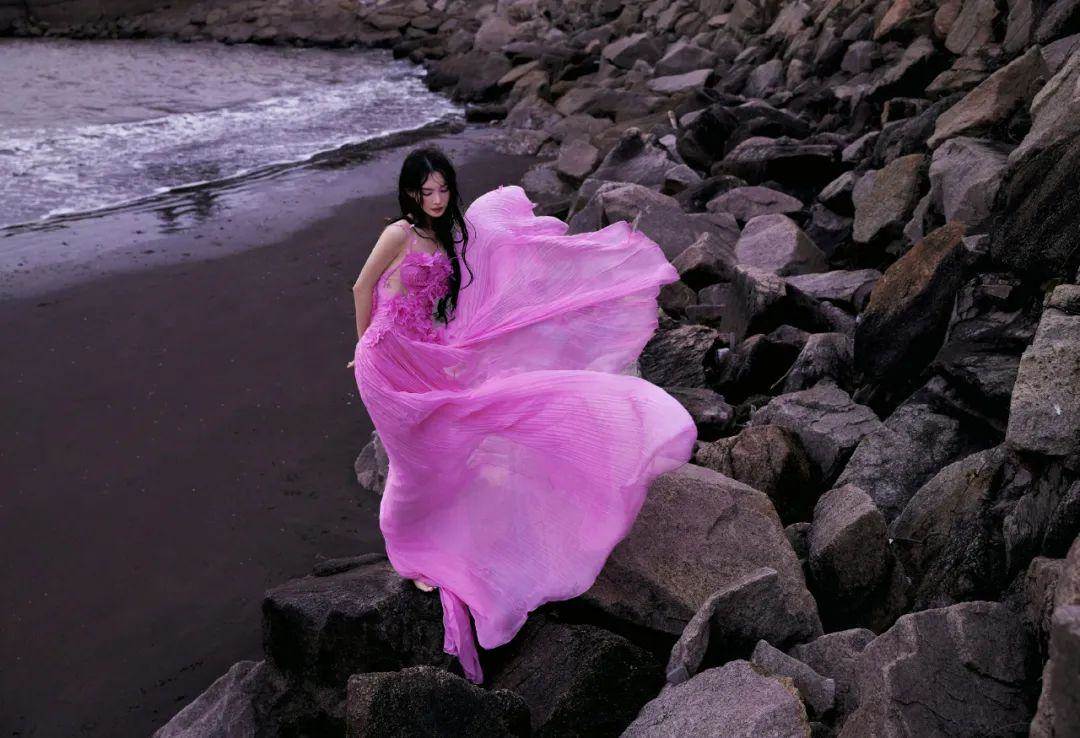 早在走紅毯之前,金晨工作室就發了一組海邊美人魚的出發圖。玫紅色的薄紗長裙在暗黑的礁石旁被襯托得更鮮艷,視覺沖擊力很強,但這種顏色的裙子離開濾鏡其實很容易顯廉價。