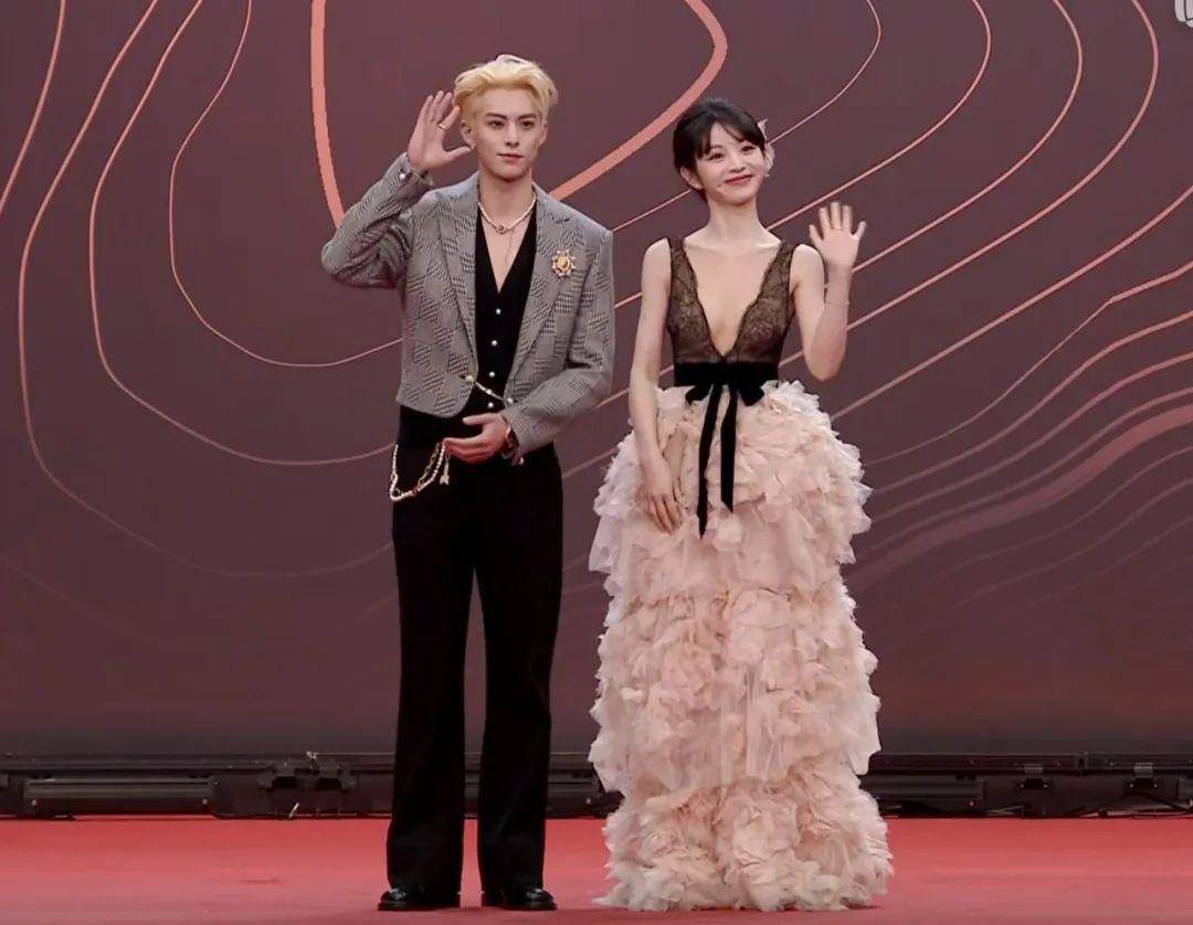95后小花田曦薇在紅毯上一直很敢穿,這次直接挑戰深V到胃部的禮裙,但笑容甜美可愛的她顯然跟裙子的風格不是很搭。染了金發的王鶴棣有點像從漫畫里走出來的美男子,有一種叛逆氣息的帥氣。