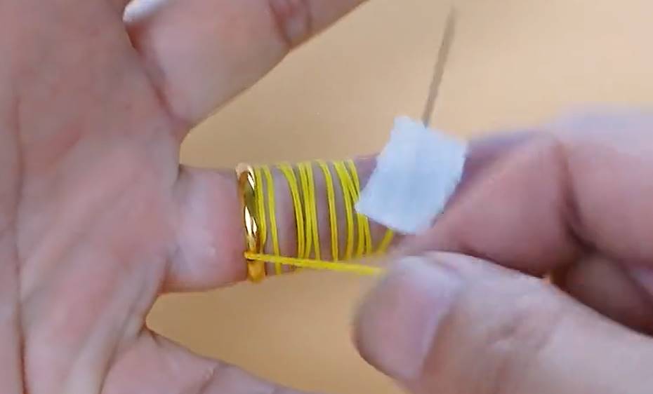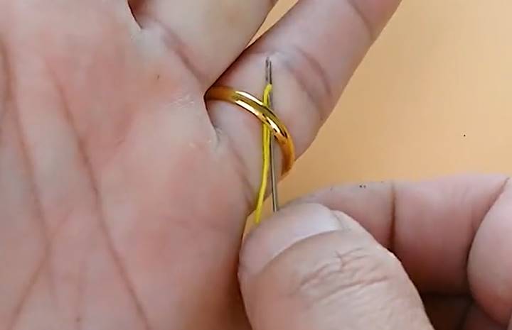 第一个巧妙的办法,就是戒指被扣住了,不能拔出来,我们就用缝纫用的针头,用一段丝线,把它的尾端从戒指里穿了出来,就算是戒指很硬,也能轻易地从针尖上穿过去。