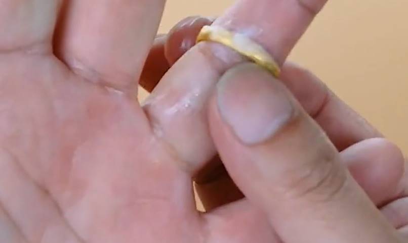 第三个技巧是,如果不能摘下戒指,我们可以拿一桶凉水,在里面泡上一分钟,这样可以帮助血管收缩,减轻手指的浮肿。然后找到一种洗头发的护发剂,把它涂在你的指环上。