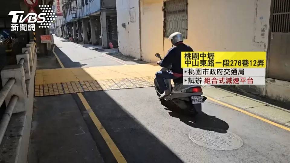 這個一片黃色的裝置,是桃園市政府交通局試辦的,組合式減速平台,選在中壢中山東路一段276巷12弄試辦。