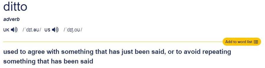這個用法起源于印刷業,用于在復制文件或表格中表示重復的內容,取代了重復寫出相同信息的需要。在這種上下文中,"ditto" 的使用變得非常方便和普遍,逐漸滲透到日常口語中。