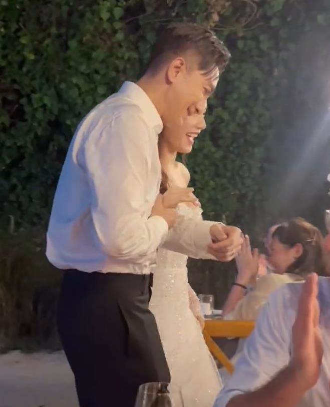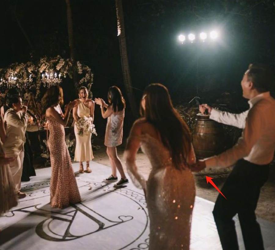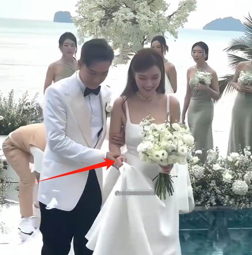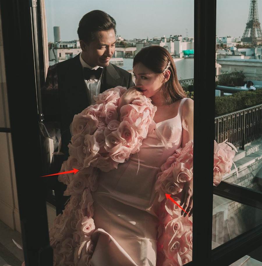 再看婚禮現場的視訊和照片,發現湯洛雯似乎也有意思遮住肚子,雖然婚紗很修身,但是穿著還勒出了肉肉,而湯洛雯本人看著還是很瘦。
