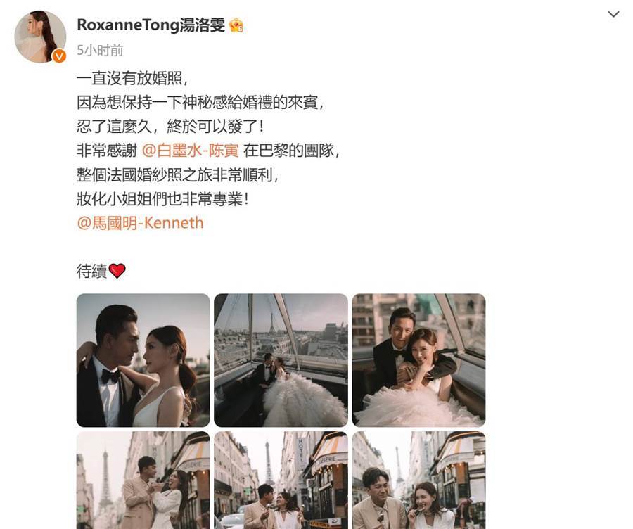 在婚禮完成之后,湯洛雯再次發微博,曬出了在法國拍攝的婚紗照,分享結婚喜悅。有正式的婚紗西裝,也有漫步街頭的情侶照,看著甜蜜又浪漫。