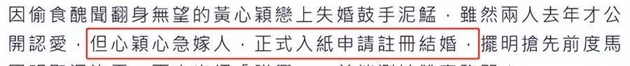 隨后馬國明跟湯洛雯走到了一起并公開了戀情,之后黃心穎單身了許久,今年和大自己14歲的樂隊鼓手泥鯭(黎萬宏)領了證。港媒還調侃黃心穎心急嫁人,還沒辦婚禮已經搶先領證了,稱其擺明了要搶先前任馬國明結婚。