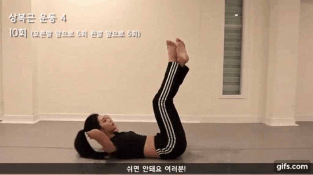 腹肌訓練4: 同樣的動作,把雙腳交叉擺放,做10次。做完一邊後再換邊交叉,同樣做10次。記緊要左右兩邊輪住做,否則腹肌訓練便會不平衡!