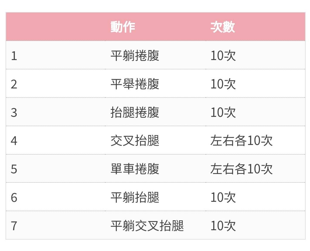 腹肌訓練6: 側腹肌可以先休息。身體再次向天平躺,跟動作3一樣把腳90度伸直抬高。再利用腹部力量,把雙腿90度上下搖擺,做10次。