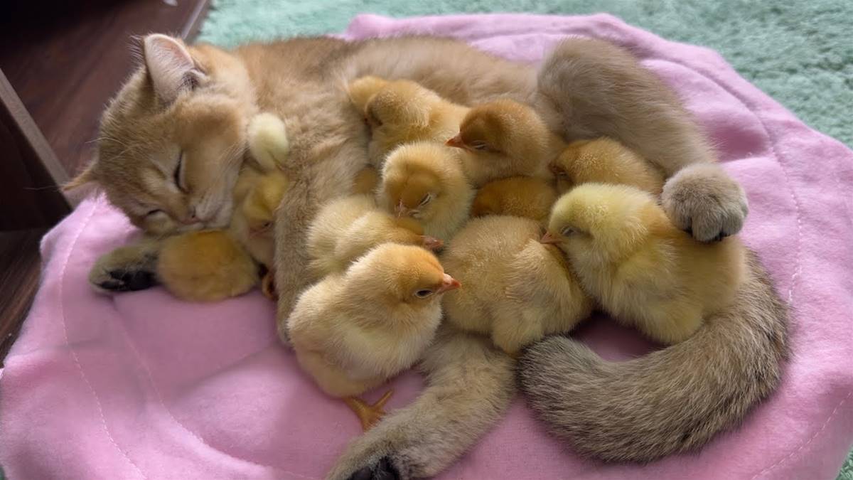 這個小貓媽媽不僅為小雞提供溫暖的庇護所,還為他們尋找食物。小貓準確地捕捉昆蟲和小魚,并小心翼翼地送到小雞們的面前。