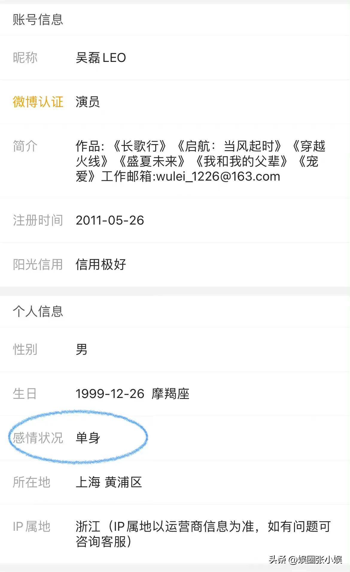 近日,有網友發現吳磊微博賬號信息中,個人感情狀況中認真地寫著兩個字:單身。