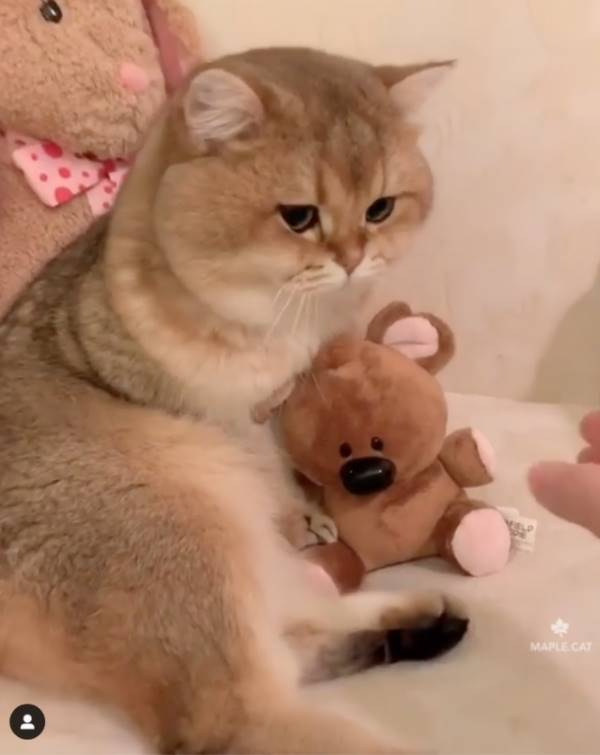 有一隻名叫「Maple」的1歲英國短毛貓超多粉絲追蹤,牠最厲害的就是塞奶,每天都一臉萌樣把馬麻融化到不要不要的,某天馬麻買了一隻熊熊娃娃給牠,沒想到那天開始就愛到不準別人亂碰,貼身守護熊熊的模樣超Q啊~▼看到馬麻伸出手,Maple就覺得不妙了。